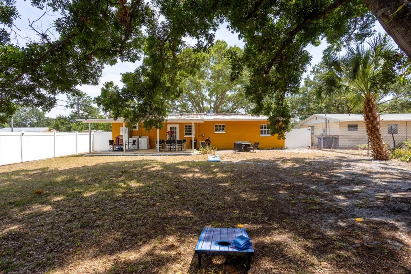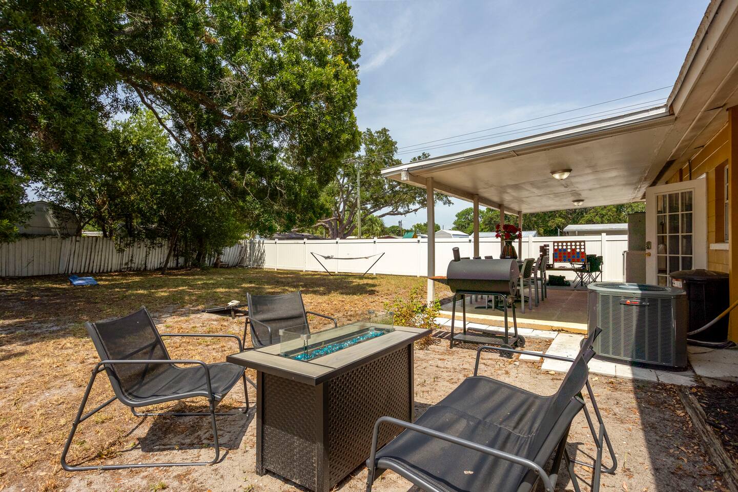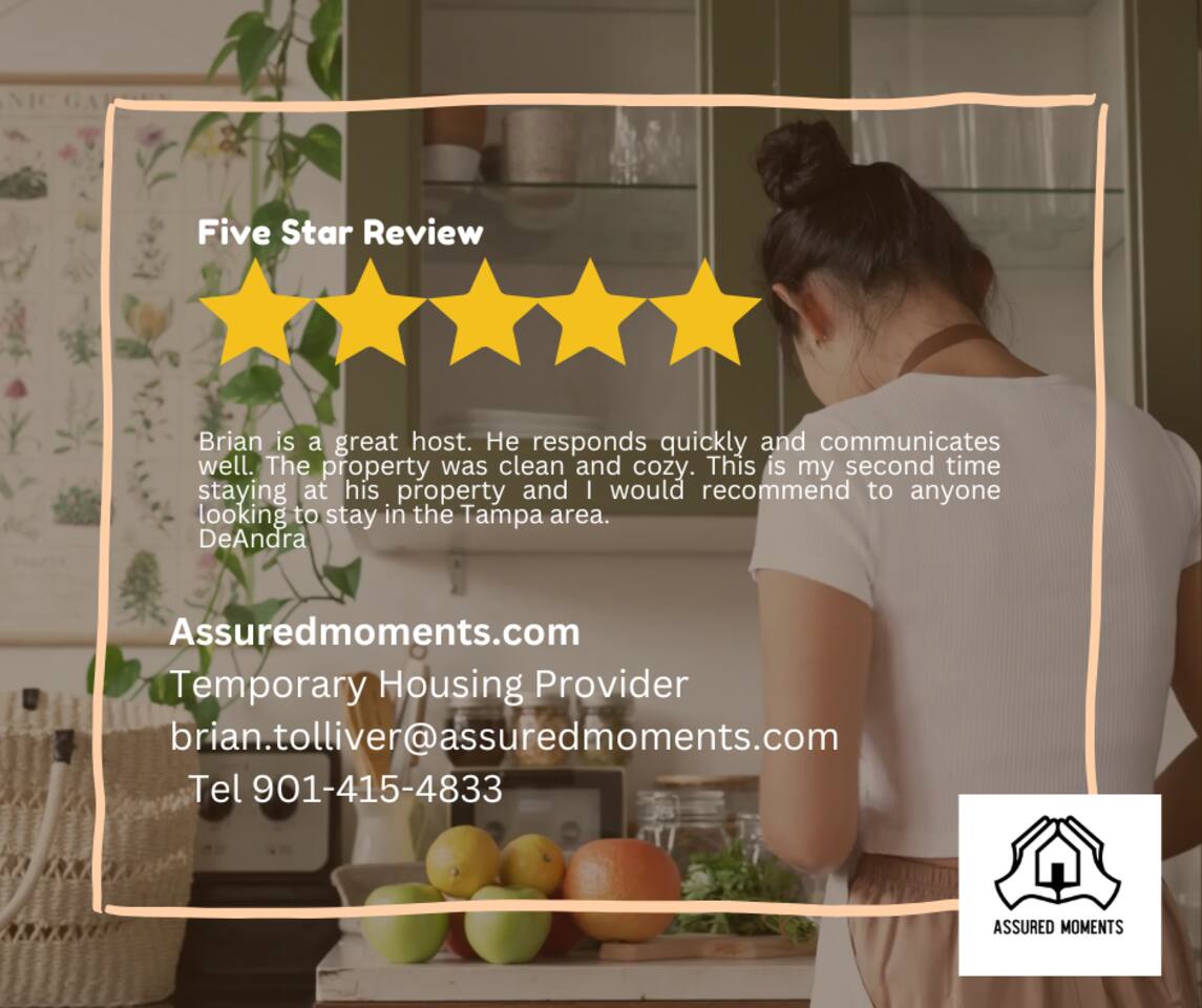 Gather together inside for a movie, family dinner, or game night! Or let's enjoy the private back yard for smores, a cookout, or a good game of corn hole! Our home is fully equipped with all you'll need during your stay. From comfortable beds, completely stocked toiletries to smart TVs and free high-speed internet. All the while, assuring a safe environment with our 24/7 safety cameras and pad locked doors. Book now and experience the best Tampa has to offer!! This 4-bedroom 2-bathroom home in South Tampa has even more to offer. You can enjoy the stunning Florida weather with our outdoor dining, family-oriented yard games and beautiful fire-pit. This home truly has something for everyone! Book today to create your newest lasting memories! Keypad: Assuring safety and keyless arrival. Living Room: Inviting comfort for morning coffee, binge-watching tv, and many laughable moments. Kitchen/Dining: The heart of the home with the latest appliances prepared to welcome all. ❥Keurig ❥Toaster ❥Microwave ❥Oven & Stove ❥Pots & Pans ❥ Utensils Bedrooms: Rest up here either in our 2 Queen Sized Bedrooms or in our double twin bedroom. Also, you can rest up in the room with our perfectly placed futon, giant bean bag, and indoor fireplace. There is a kid’s pack in play placed in the closet for accommodation of parents traveling with a baby or toddler. Placed inside the closets as well are extra blankets and storage bins for your clothing. Bathrooms: Professionally cleaned & stocked with fresh towels and toiletries. Amenities: Family games, Smart TVs, High-speed Wi-Fi, books and central A/C. Outdoor: Private Backyard, Dining Area, Charcoal Grill, Electric Fire-pit, and Washer/Dryer set. Unforgettable memories are guaranteed here! 🏝🏝🏝